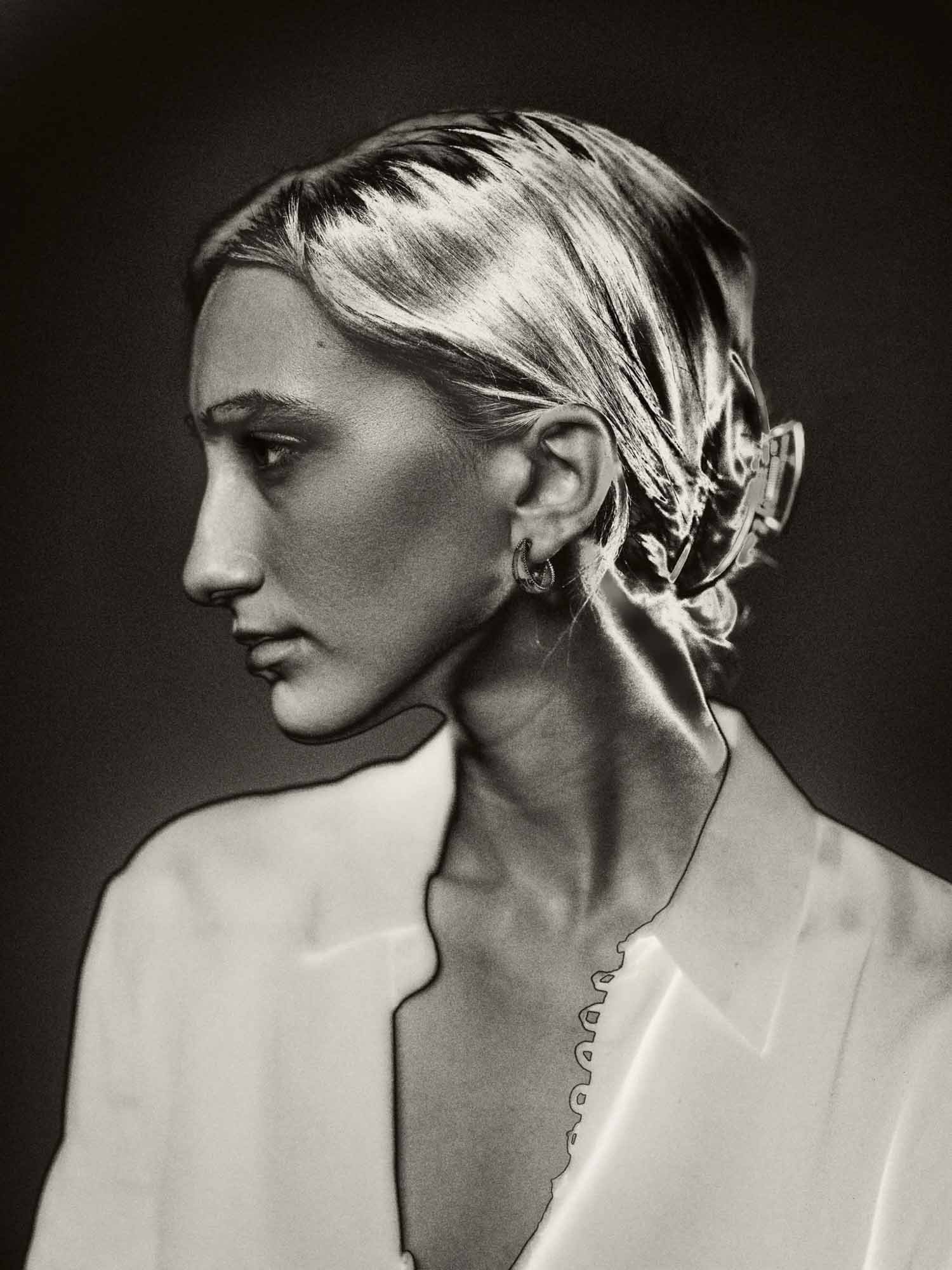 Inspired by Alexander Rodchenko’s angles, framing and hard contrasts of light and shadow, I compose the subjects’ likeness along stark geometric lines. Projected geometric shapes, mirrors and layered reflections fracture and multiply their figure, echoing the photomontage tradition and even Dziga Vertov’s film experiments with oblique angles and long- and double-exposures.
